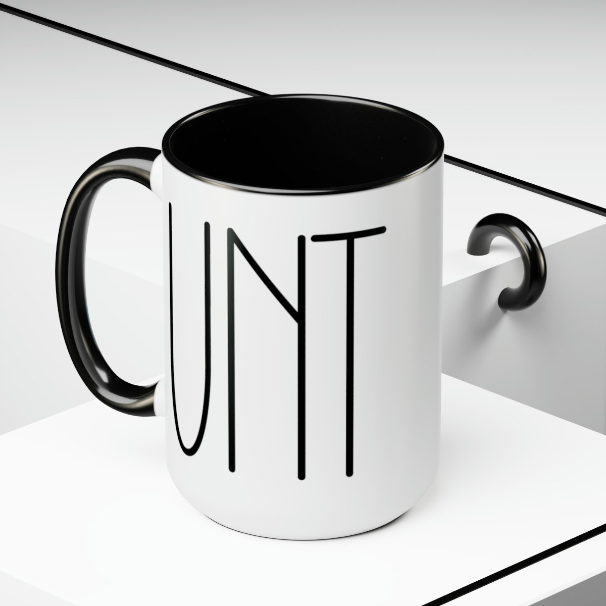 White mug with black handle and black interior. The text of UNT in black is on the mug. The black handle is the letter C. So it basically says C U Next Tuesday.